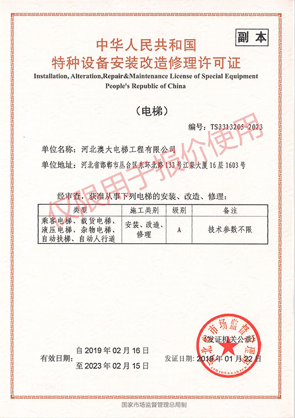 河北澳大電梯工程有限公司是集電梯銷售、安裝、維護(hù)保養(yǎng)為一體的專業(yè)化電梯公司。公司具有國家質(zhì)量監(jiān)督檢驗總局頒發(fā)的“電梯安裝改造維修A級”資質(zhì)許可證。下設(shè)市場部、工程部、維保部、技術(shù)部、行政部及電梯配件公司。